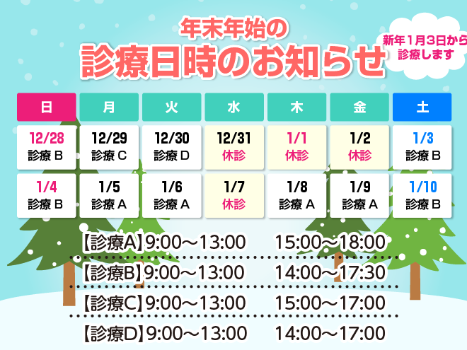 12月31日(水)・1月1日(木)・1月2日(金)は休診とさせていただきます。